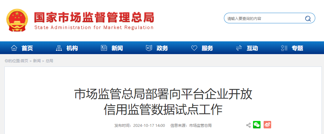 近日,市场监管总局部署在北京市海淀区开展向平台企业开放信用监管数据试点工作。